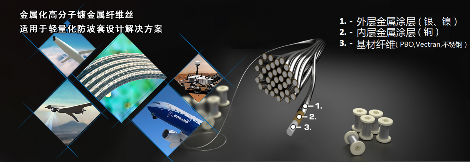 鍍金屬導電纖維絲是在高分子基材上雙層均勻涂鍍金屬,在航空航天線纜減重、機器人電纜屏蔽層、柔性天線、船舶拖曳電纜等減重和強度性能要求高的精密行業以更高的性能替代標準銅線,用作電纜、線束EMI屏蔽和專用導線。